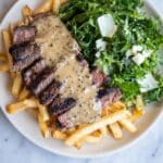 - Serve – Plate the steak alongside rocket salad and your choice of crispy fries. Generously spoon the peppercorn sauce over the steak and finish with freshly cracked black pepper.
