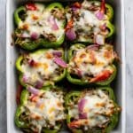 Philly Cheesesteak Loaded Stuffed Peppers are a delicious low-carb twist on the classic Philly cheesesteak sandwich. Tender ribeye steak is cooked with sautéed onions, green peppers, and mushrooms, then stuffed into roasted green bell pepper halves and topped with melty provolone cheese. This gluten-free, satisfying main course is perfect for a hearty weeknight dinner.