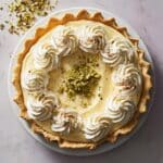 You can freeze the pie once it’s fully assembled without the whipped cream topping. Wrap it securely in plastic wrap and then foil, freezing for up to 2 months. Thaw it overnight in the fridge before adding fresh whipped cream and pistachio garnish.