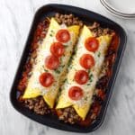 Pizza enchiladas are a creative and delicious fusion dish combining the flavors of classic pizza with the comforting style of enchiladas. Soft flour tortillas are filled with pepperoni, Italian sausage, mozzarella, cheddar cheese, and pizza sauce, then rolled up and baked until bubbly and golden. This easy-to-make meal is perfect for weeknight dinners and is sure to please kids and adults alike.