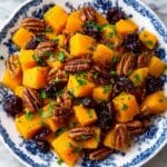 This delicious Roasted Butternut Squash with Cranberries and Pecans is a perfect balance of sweet and savory flavors. Tender roasted butternut squash cubes are glazed with maple syrup and cinnamon, then topped with tart dried cranberries and crunchy toasted pecans. Finished with a fresh parsley garnish, this seasonal side dish is ideal for fall and holiday meals.