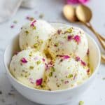 Rose pistachio cheesecake ice cream is a luxuriously creamy, no-churn dessert infused with floral rosewater, crunchy pistachios, and the tang of cream cheese. This elegant and exotic treat combines the richness of cheesecake with the refreshing flavor of rose and the texture of pistachios, making it a perfect, easy-to-make indulgence that requires no ice cream maker.