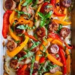 A vibrant and flavorful Sausage and Peppers recipe featuring precooked Italian chicken or turkey sausage roasted with colorful bell peppers and onions, seasoned with aromatic herbs and spices. This easy oven-roasted dish is perfect for a quick weeknight dinner, offering a well-balanced combination of protein and vegetables with a bright, tangy finish from red wine vinegar.