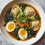 Savory Dumpling Ramen Bowl with Soft-Boiled Eggs and Fresh Greens Recipe