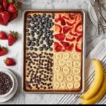 Picture the pan divided into four sections. In the first section, arrange sliced strawberries; in the second, scatter fresh blueberries; the third gets the sliced bananas, and the last section is dedicated to chocolate chips. This method keeps flavors distinct while offering something for every taste bud!