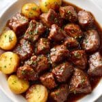 Tender slow-cooked beef bites paired with buttery, smoky baby potatoes infused with garlic and herbs, creating a comforting and flavorful one-pot meal perfect for any occasion.