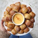These soft pretzel bites are best enjoyed fresh for that perfect contrast between soft inside and slightly crispy outside. However, you can store any leftovers in an airtight container at room temperature for up to 24 hours. Keep the vegan cheese sauce refrigerated in a sealed jar or container for up to 5 days to maintain its creamy texture and fresh flavor.