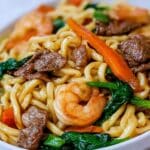 This Steak & Shrimp Stir-Fried Noodles recipe combines tender slices of flank steak and succulent shrimp with vibrant vegetables and flavorful Asian-inspired sauces. Perfect for a quick and satisfying weeknight dinner, this dish delivers a wonderful balance of protein, veggies, and noodles all tossed together in a savory, slightly sweet sauce.