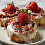 These Strawberry Cheesecake Cinnabon Rolls combine the classic cinnamon roll concept with a luscious strawberry cheesecake filling and cream cheese frosting. Perfect for a decadent breakfast or dessert, these soft, fluffy rolls are filled with strawberry jam, fresh strawberries, and a creamy cheesecake mixture, then topped with a smooth cream cheese frosting and optional fresh strawberry slices and graham cracker crumbs for added texture and flavor.