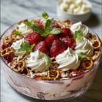 Strawberry Pretzel Salad is a delightful layered dessert featuring a crunchy, salty pretzel crust topped with a creamy sweetened cream cheese layer and a luscious strawberry gelatin topping studded with juicy strawberries. Perfect for parties and gatherings, this no-bake dessert combines tangy, sweet, and salty flavors in each bite.