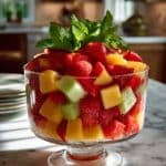 This fruit salad pairs wonderfully with light dishes like grilled chicken, fish, or even as part of a picnic spread alongside sandwiches. Its refreshing sweetness and balance of acidity help cleanse the palate and complement savory meals without overwhelming.
