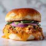 Spread a generous layer of the creamy sauce on the bottom half of each slider bun. Layer on the sliced chicken, a slice of cheddar (or your choice of cheese), shredded lettuce, a tomato slice, and pickles if you’re using them. Top with the bun halves and get ready to dig in!
